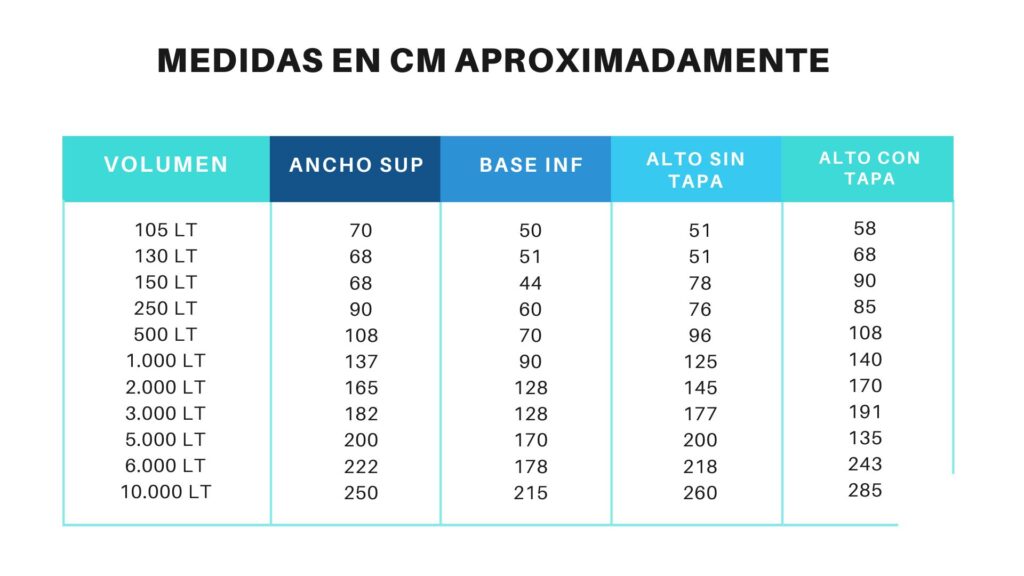 - Material: Polietileno lineal 100% virgen de densidad media – baja. Alta resistencia al impacto, a disolventes y agentes químicos.