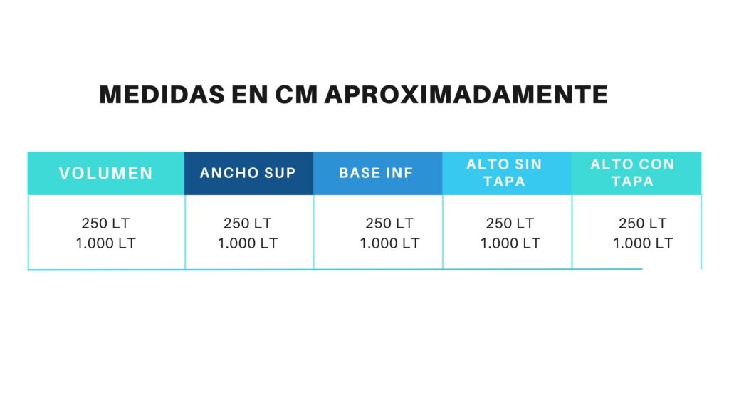 - Material: Polietileno lineal 100% virgen de densidad media – baja. Alta resistencia al impacto, a disolventes y agentes químicos.